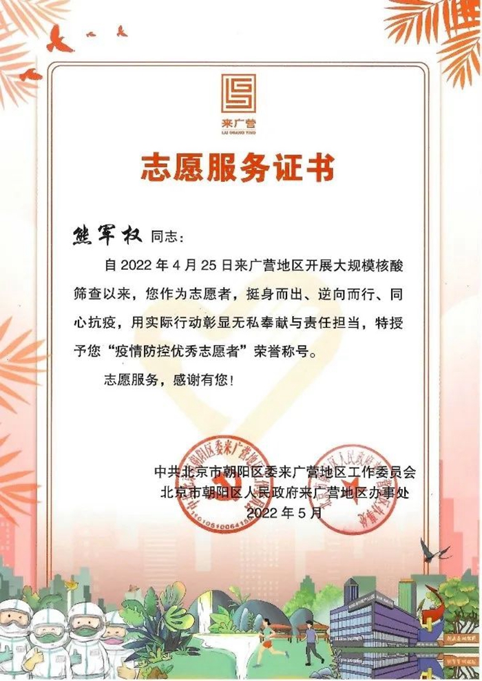 我真心地感谢北京化工集团、华腾东光公司领导给予了我这样一次难得的、意义深远的志愿服务机会,公司党总支、工会还给我送来了慰问和温暖。如果再有这样的机会,我依然会积极去服务,尽自己的努力为身边的人做一些力所能及的事。我志愿,我快乐,请组织放心,请领导放心,为了北京的平安,为了社区的平安,作为国企职工,我一定坚持到底,战斗到底,直到北京全面清零,共创乐鱼leyu 的美好家园。