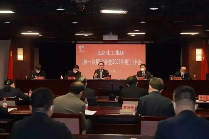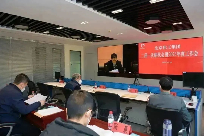 北京化工集团二届一次职代会暨2023年度工作会于12月28日召开,会议深入学习贯彻党的二十大、中央经济工作会议及市委十三届二次全会精神,总结2022年工作,研究部署2023年任务,党委书记、董事长王国华作总结讲话,党委副书记、工会主席吴瑞峰主持会议,集团外部董事,领导班子成员及高管人员出席会议;总部正、副部长,高级专家、专家、专职董监事,各二级单位领导班子成员和职工代表170余人参加会议。