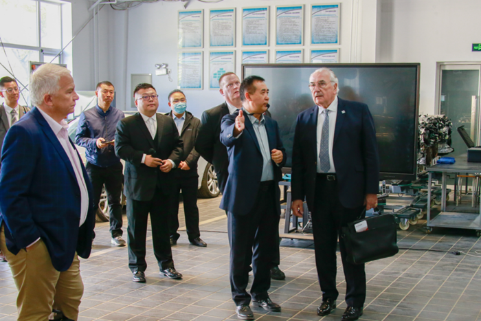 按照精心设计的接待路线,英国职业技能访问团一行先后来到学院数控车间、数控世赛基地、文物修复实训室等多个教学场所参观。